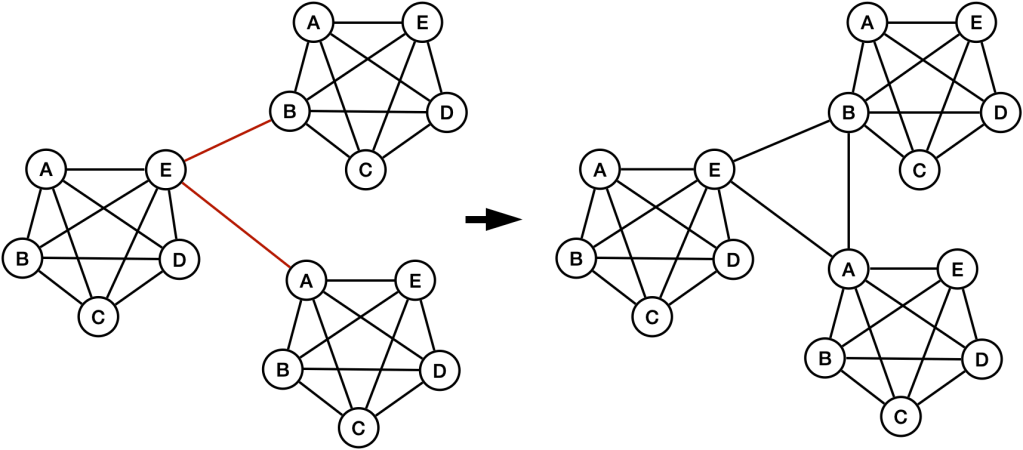 However, as we saw here, people or groups of people within a social network have the natural tendency to form triads. As relationships shape over time, open triads become closed. This has a knock-on effect inside the network as more new connections are established through open triads. Below there is an example of an open triad, marked in red, which evolves into a closed triad. This makes the coordination of 3 teams much easier through a triad of representatives.