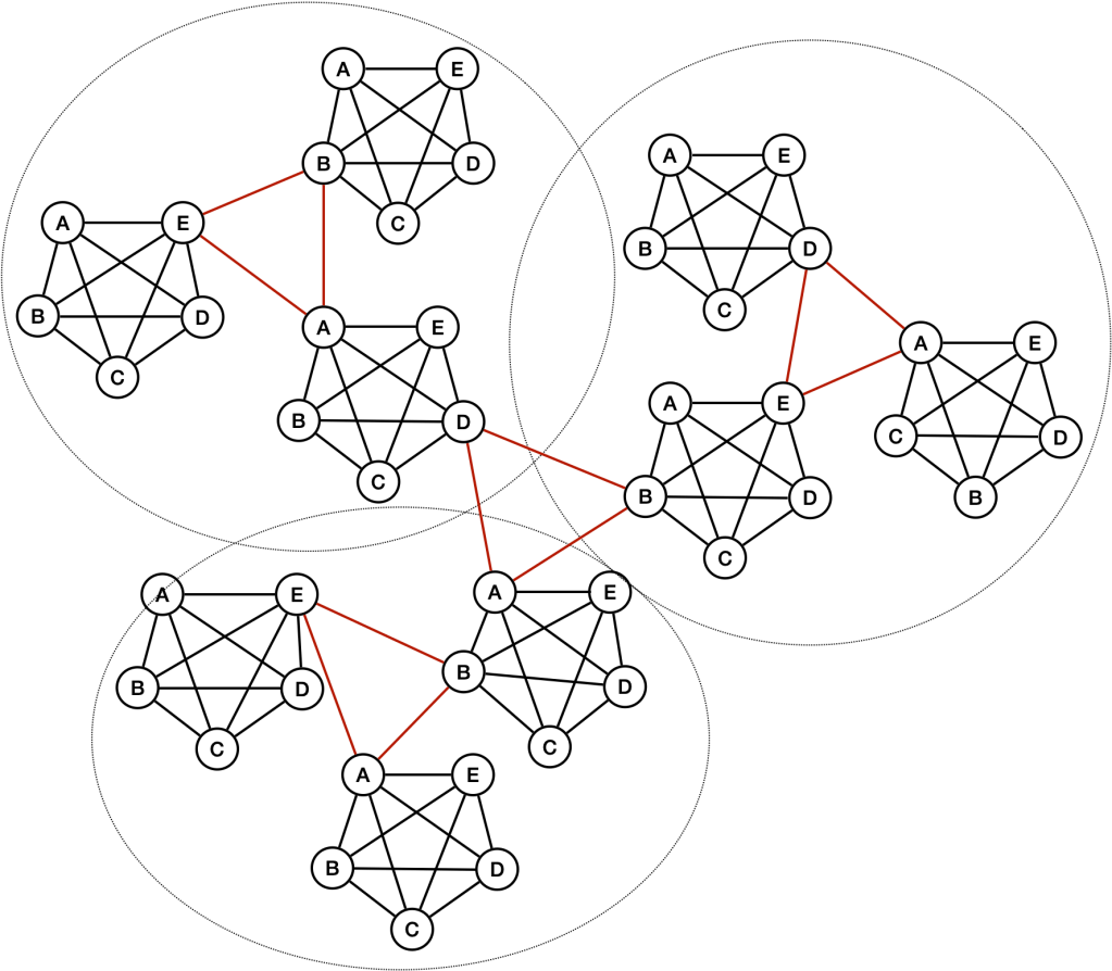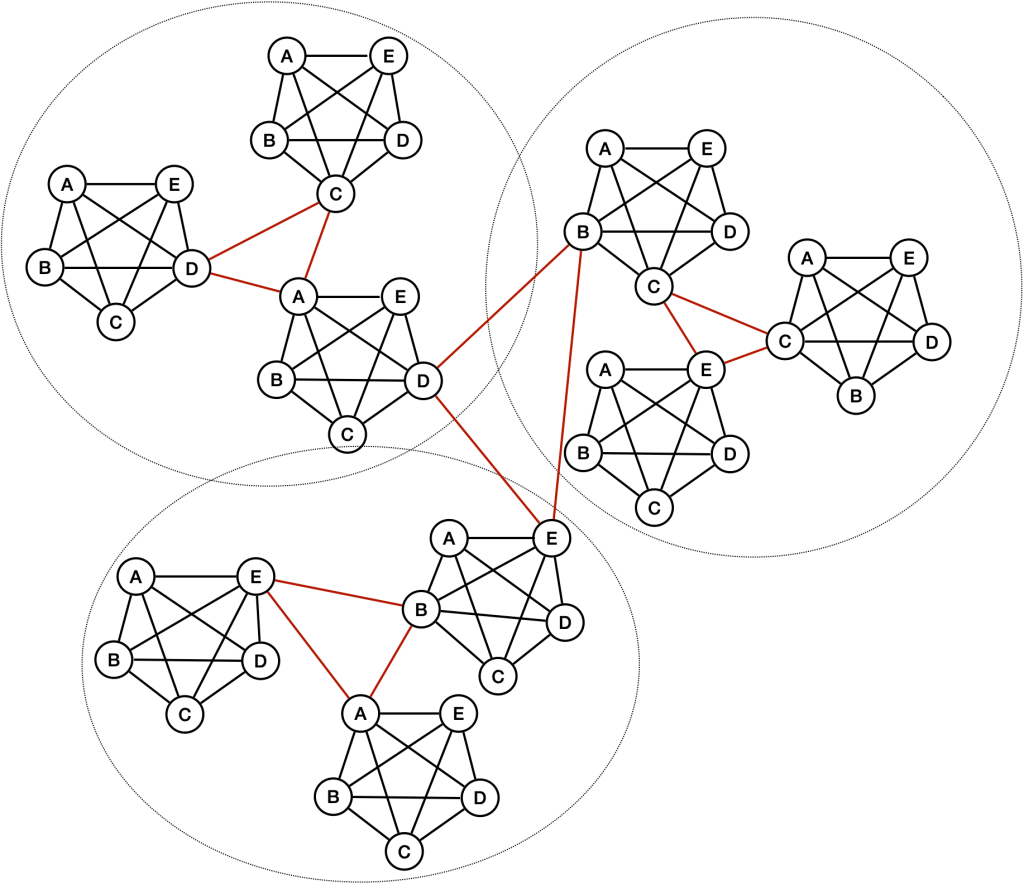 Of course, in a network of multiple teams, there are more social ties that are not shown above while teams do not all comprise of 5 people. In reality, networks are more asymmetrical, complex, and ever-evolving than shown above.